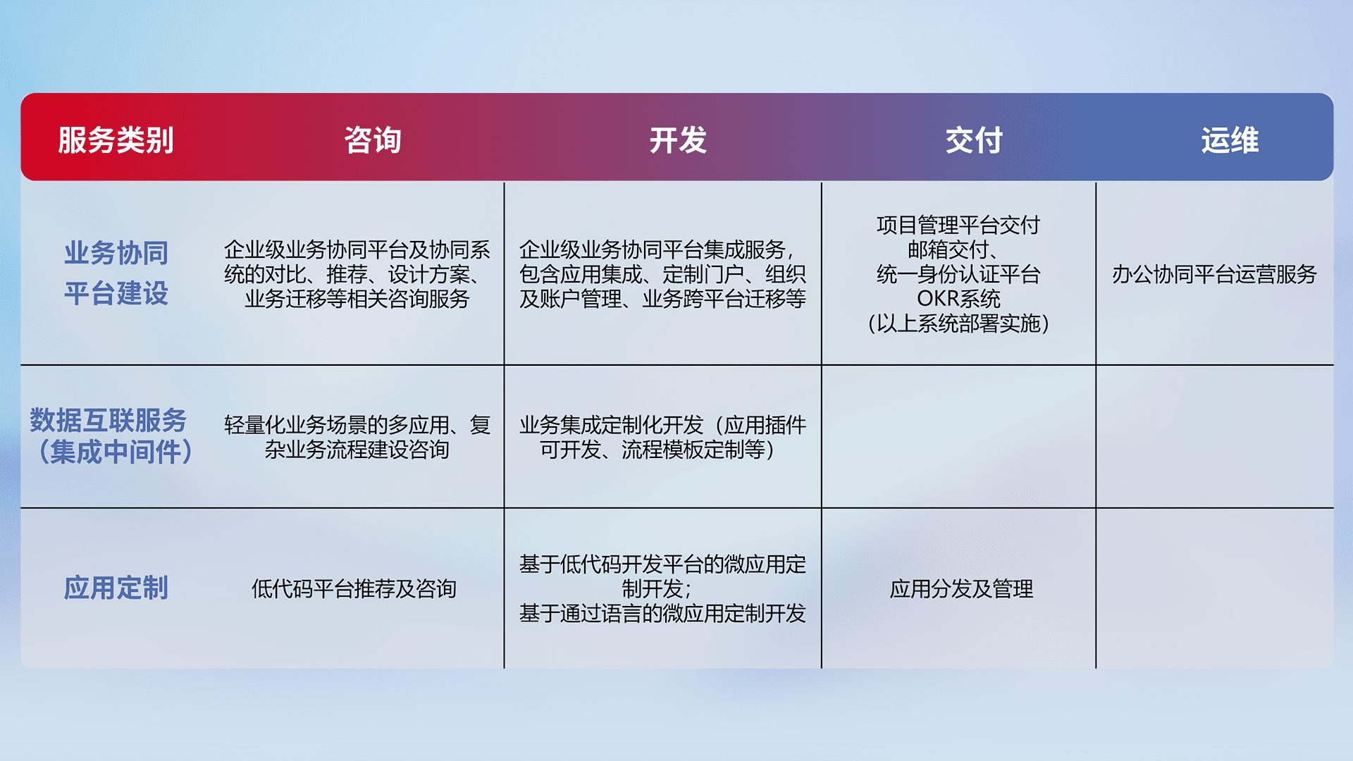 针对钉钉、、企微、、、IDaas等平台级产品提供产品的规划、、方案、、、、交付、、定制化开发等服务,,,,实现如统一协同办公、、智能客户服务、、混合会议管理、、、智能数据查询、、、等业务场景,,,,实现数字化转型。。。